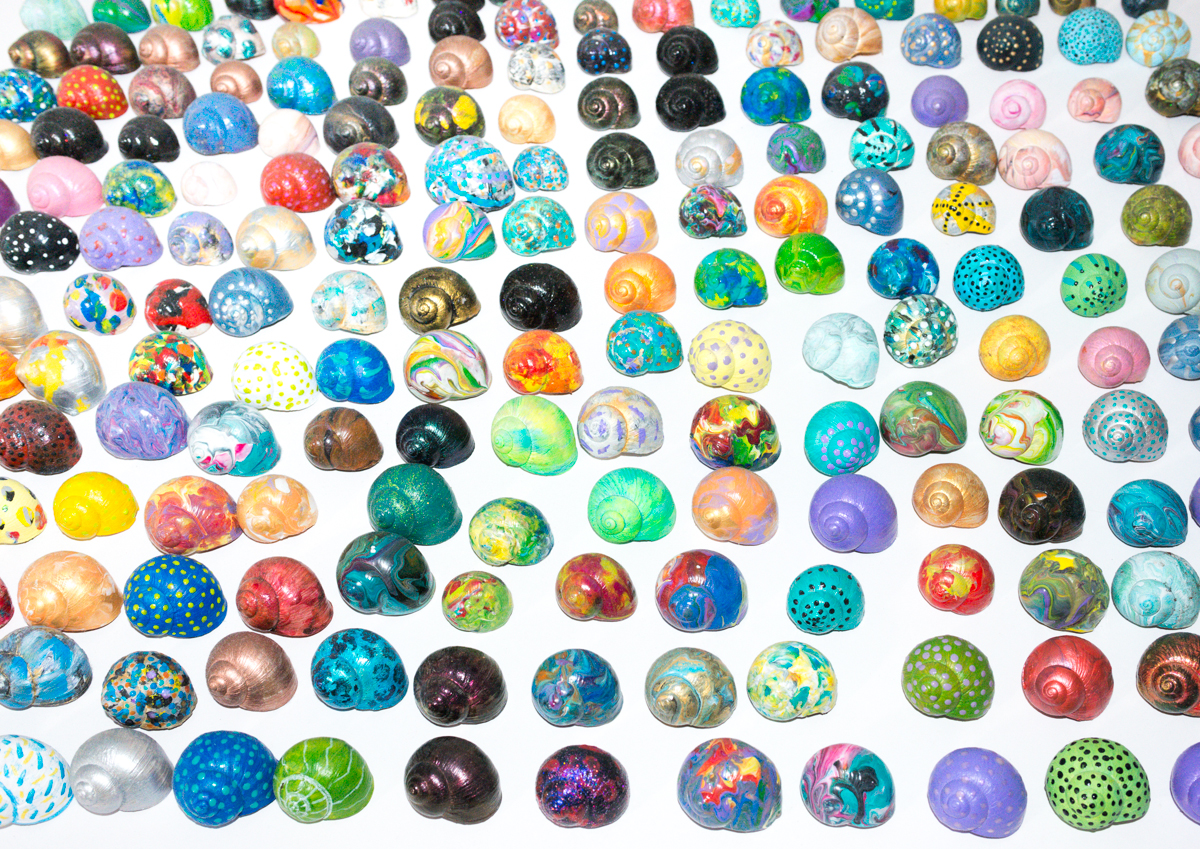 Bunt bemalte Schneckenhäuser von Carola Vahldiek (die nicht nur Autorin und Fotografin, sondern auch Künstlerin ist). Jedes natürliche Schneckenhaus ist von Natur aus ein Unikat. Jedes der in der Natur gesammelten leeren Schneckenhäuser ist individuell bemalt und ist so zu einem kleinen Kunstwerk geworden.